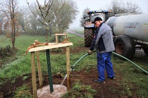 Jung und alt packten mit an und so ging es mit der Pflanzung der ersten Partie der Bäume zügig voran. An vier verschiedenen Stellen in der Gemarkung wurden Winterlinden, Wildbirnen, Speierling, Elsbeere und Esskastanien sach- und fachkundig gepflanzt und gegen Wildverbiss geschützt. Alle Bäume sind so ausgewählt, dass sie dem Klimawandel mit heißen Sommern und langen Trockenphasen standhalten können. Sie sind eine Bereicherung der heimischen Baumvegetation, von denen viele Insekten und Vögel profitieren können.